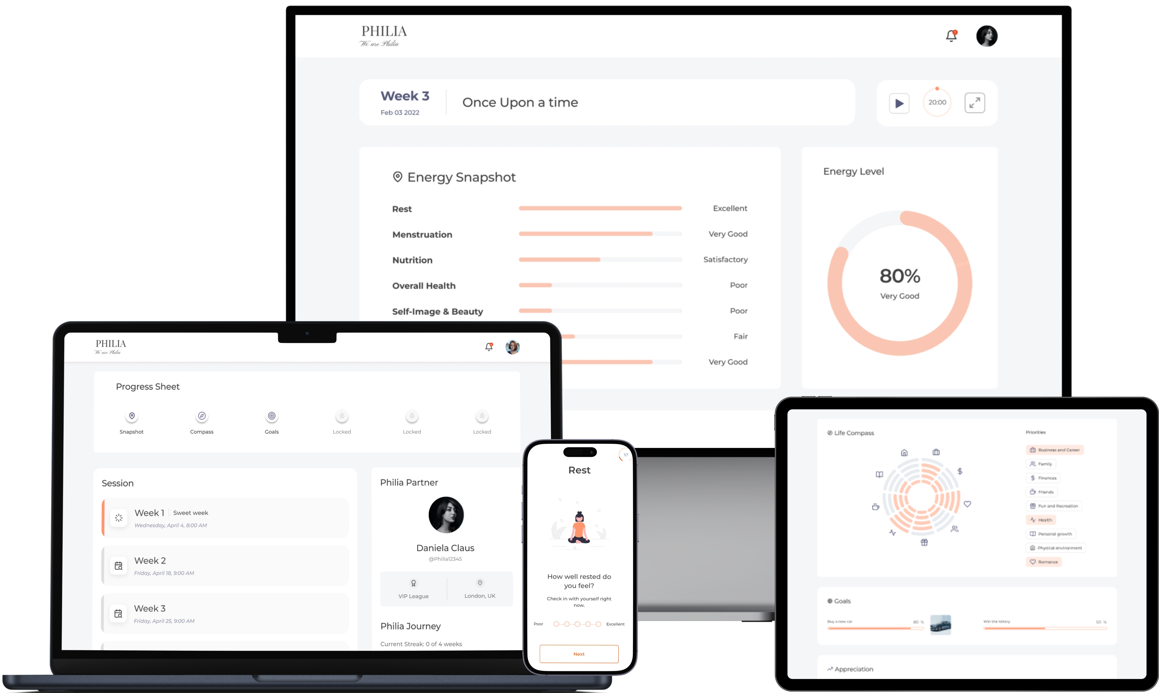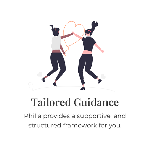 By joining Philia you get mood and goal tracking tools as well as clear instructions to assessing your progress in coaching sessions.